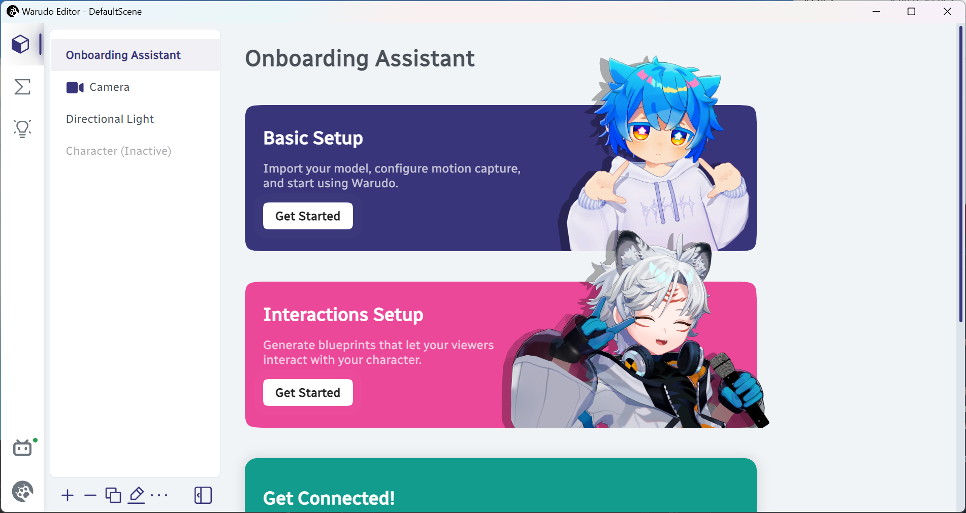 Hay dos maneras de configurar la captura de movimiento en Warudo. La primera y preferida manera es usar el asset Onboarding Assistant que viene con cada escena. Simplemente haz clic en Basic Setup → Get Started para iniciar el proceso de incorporación y seguir las instrucciones.