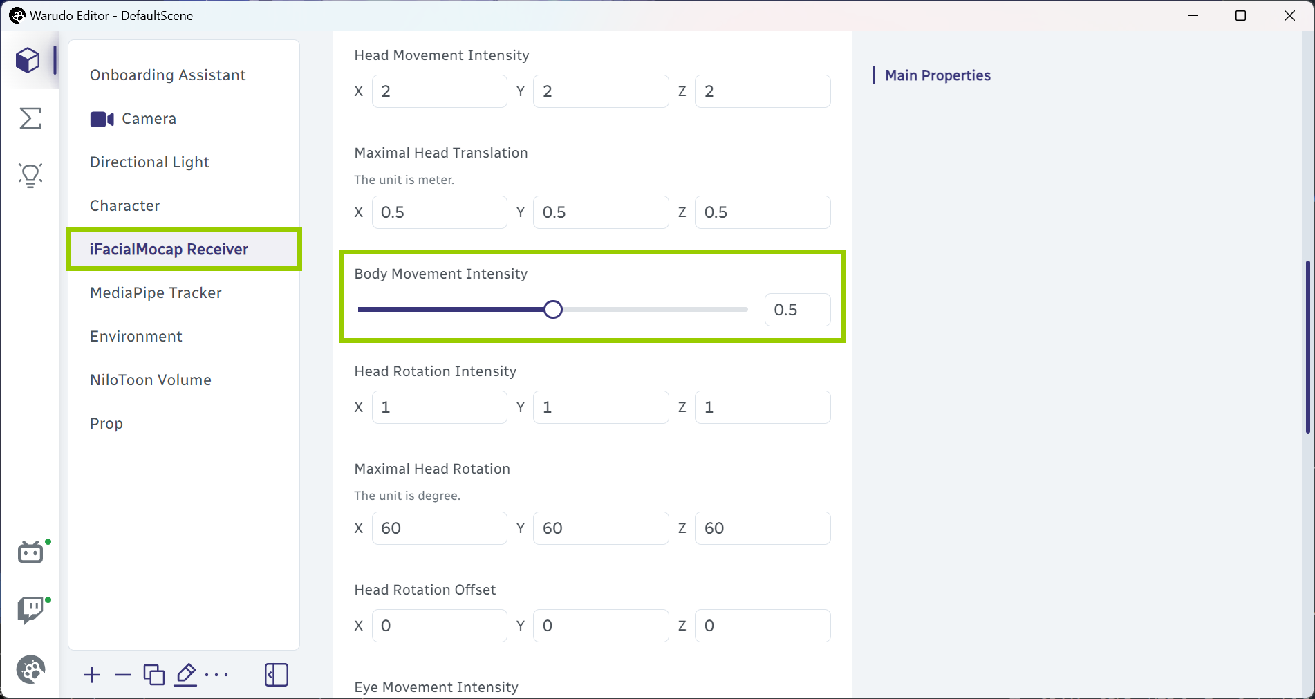 Después de que el proceso de incorporación esté completo, puedes seleccionar los assets de captura de movimiento relevantes para personalizar aún más tu seguimiento. Por ejemplo, si estás usando iFacialMocap, puedes notar que Warudo agrega algo de movimiento al cuerpo de tu personaje cuando tu cabeza se mueve. Si esto no es deseable, puedes establecer Body Movement Intensity en 0 en el asset iFacialMocap Receiver.