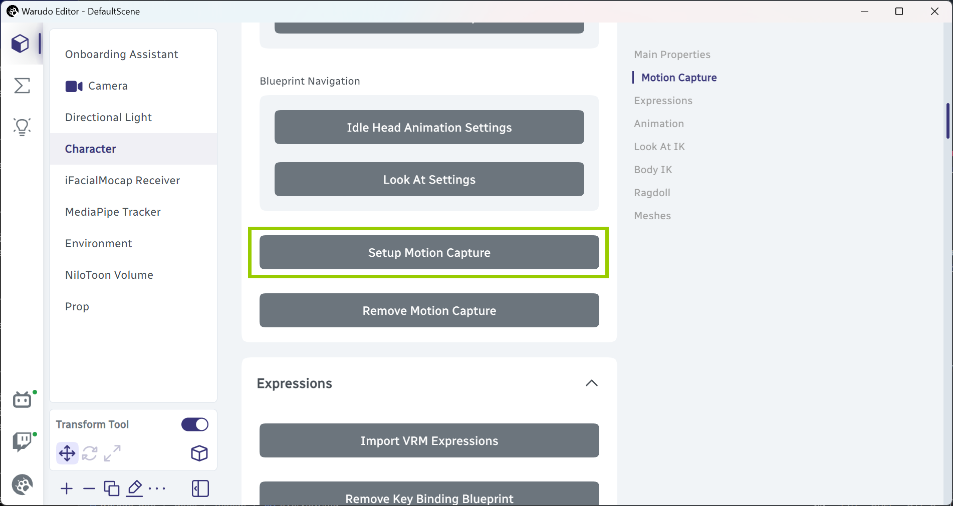 La segunda manera de configurar la captura de movimiento es usar Character → Setup Motion Capture. Esto te permite configurar el seguimiento facial y/o el seguimiento de pose directamente. Sin embargo, algunos pasos de verificación en el proceso de incorporación también se omiten.