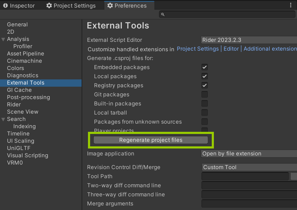 Esto proporciona más información al construir el mod, para que puedas verificar la consola por cualquier error. Si has verificado que los scripts están colocados en la carpeta del mod pero el log de construcción establece que no se encontraron scripts por lo que la compilación se omite, es probable que los archivos .csproj no se generaron correctamente en tu proyecto. Necesitas hacer clic en Edit → Preferences → External Tools y hacer clic en Regenerate project files: