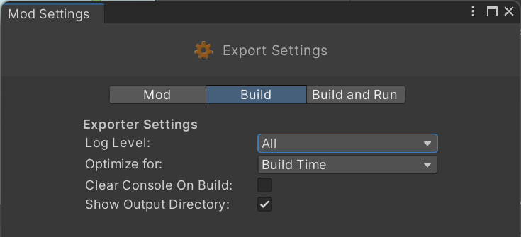 Si estás incluyendo scripts en tu mod, recomendamos establecer Log Level en All y desmarcar Clear Console On Build en la ventana de Configuración de Mod:
