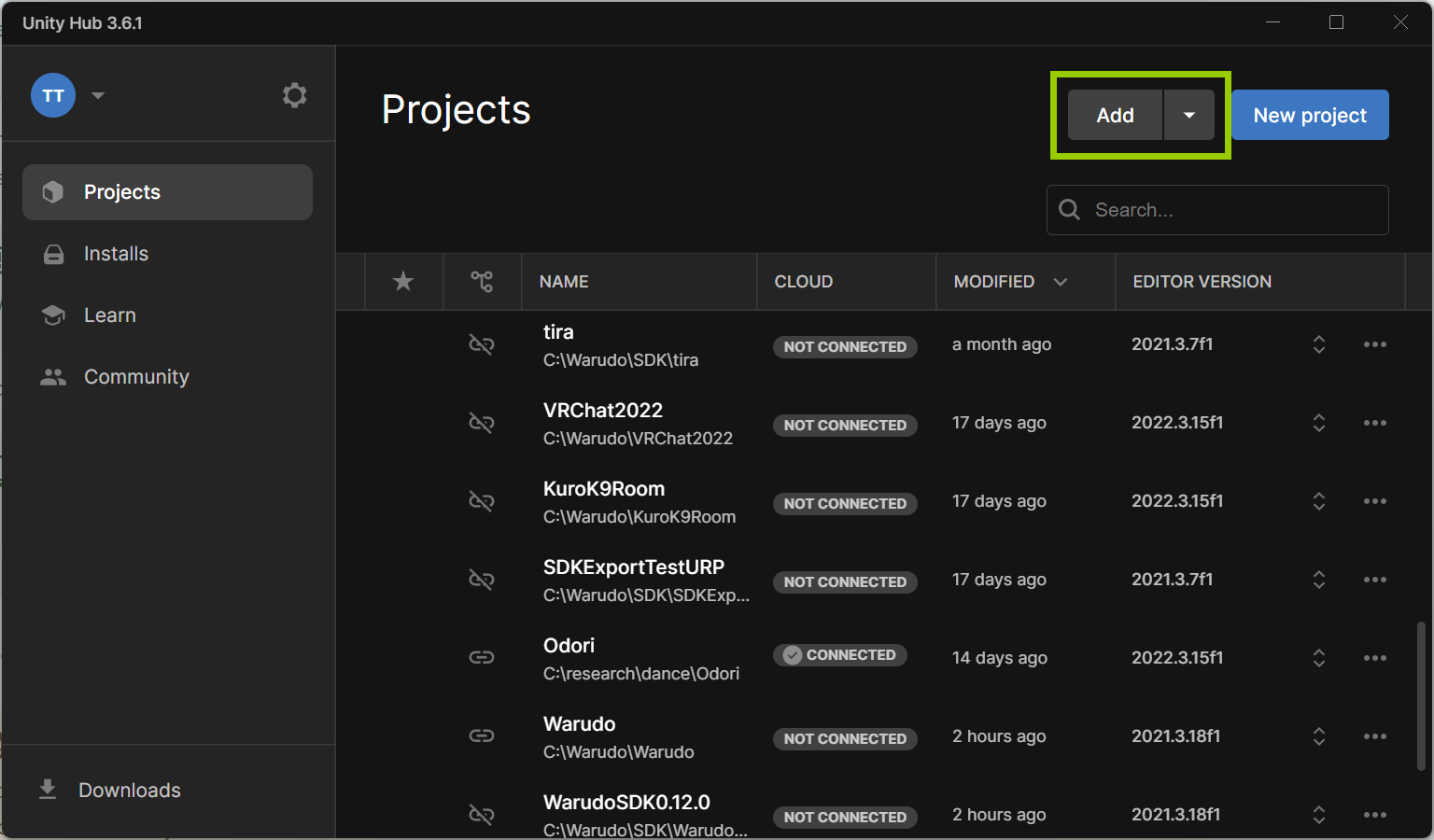 D:\Softwares\Unity\2021.3.18f1\Projects\WarudoModding. - En Unity Hub, haz clic en "Add" y selecciona la carpeta de arriba.