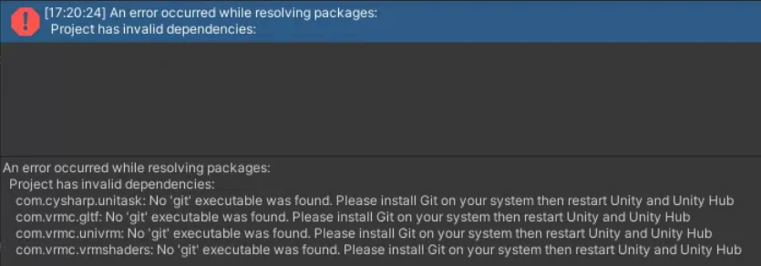 Si encuentras un error con el mensaje An error occurred while resolving packages / Error adding package al hacer clic en él revela un mensaje similar a No 'git' executable was found. Please install Git on your system then restart Unity and Unity Hub, significa que Git no está instalado en tu sistema.
