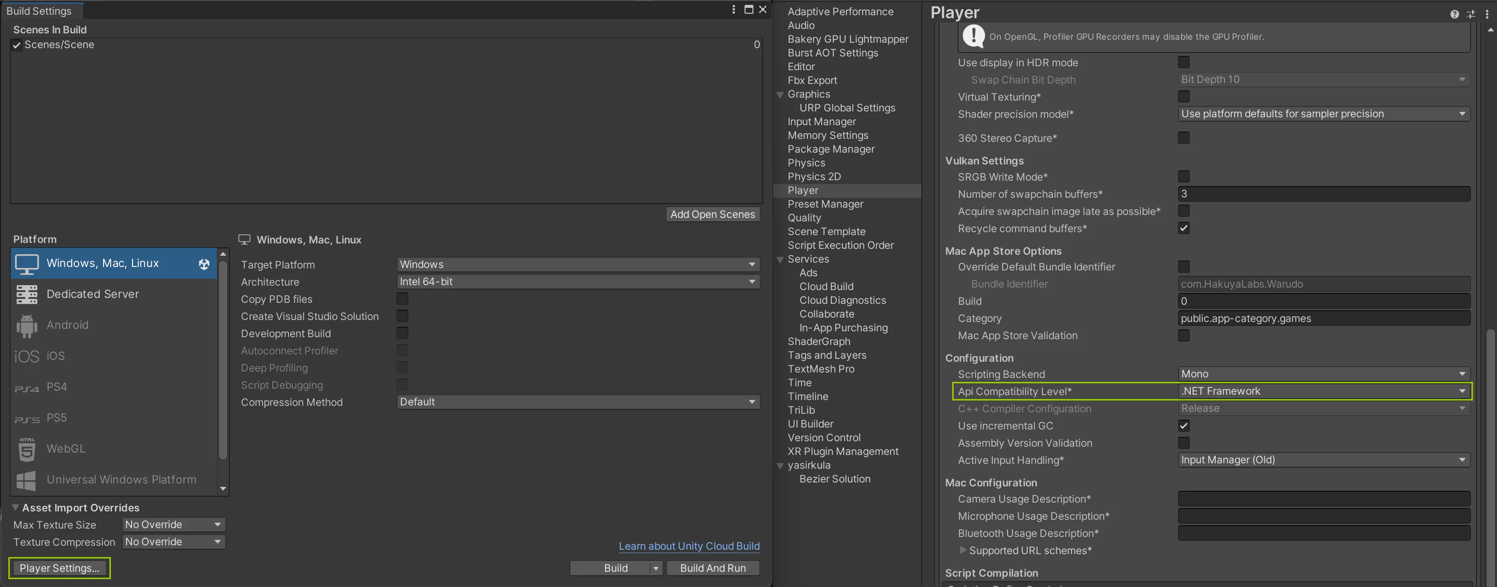 Confirma que el Api Compatibility Level en File → Build Settings... → Player Settings... → Other Settings esté configurado en .NET Framework.