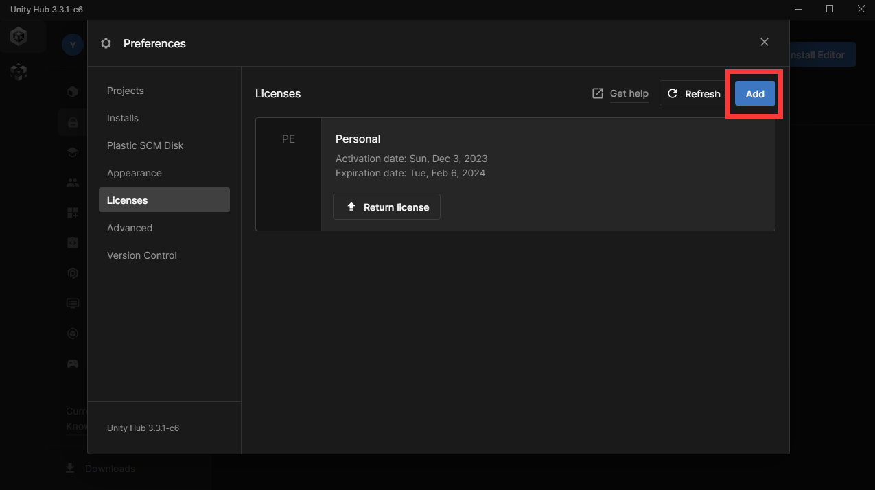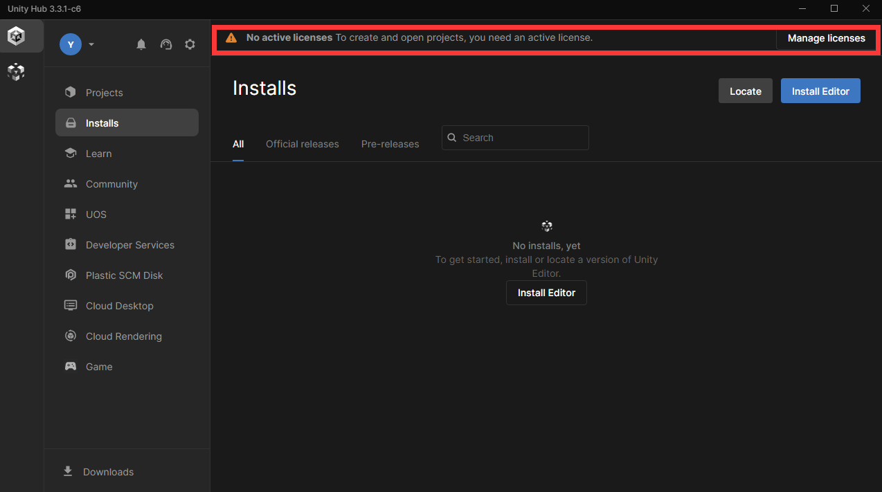 Si omitiste la activación en el paso anterior o la activación falló, también puedes activar manualmente la licencia más tarde en Unity Hub.