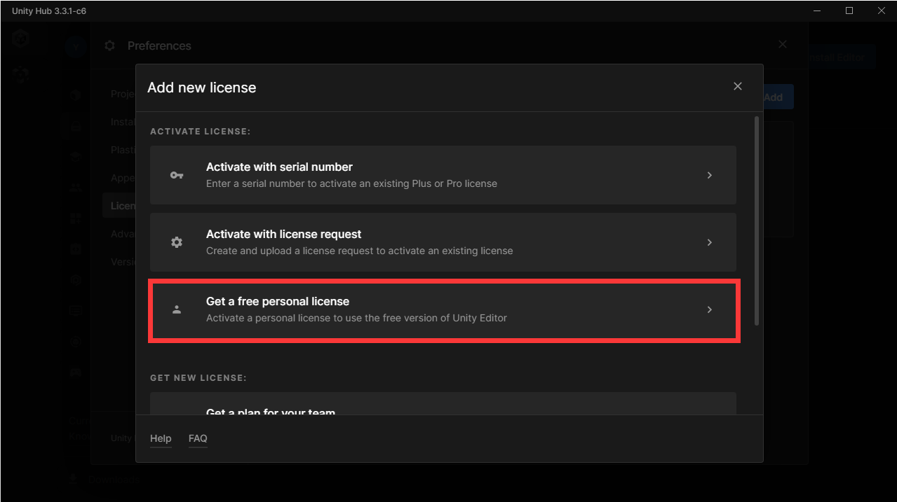Si cumples los términos para la Edición Personal de Unity, puedes elegir activar y obtener una licencia personal aquí.