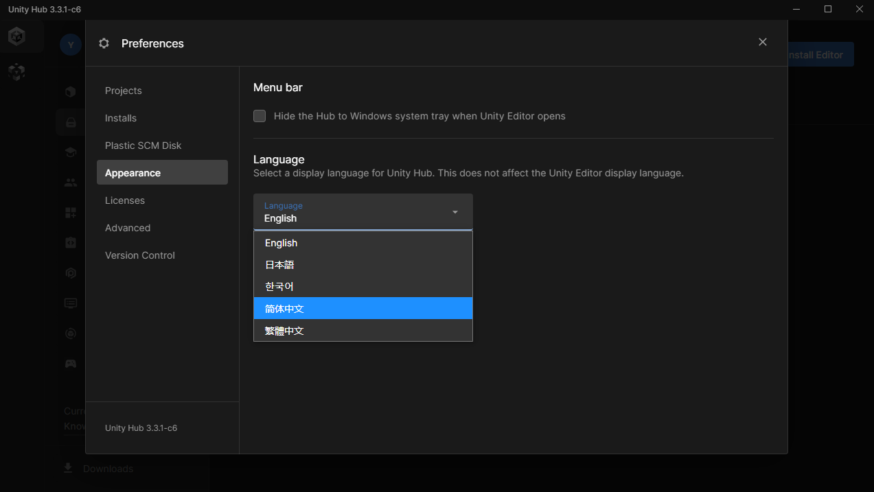 Puedes cambiar el idioma de Unity Hub en 【Preferences】-【Appearance】.