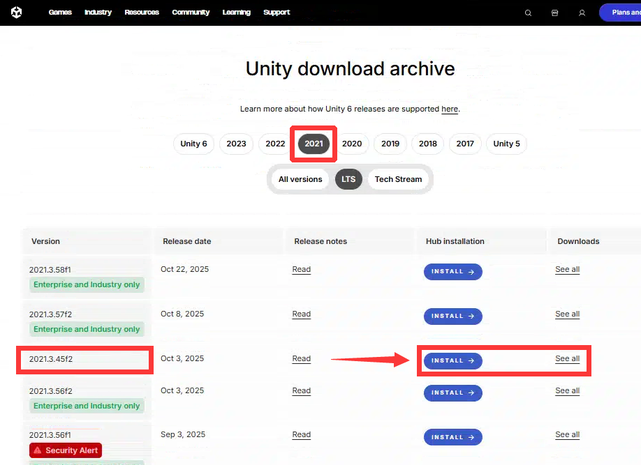 - Bajo la pestaña 【Unity 2021.X】, encontrar 【Unity 2021.3.18 (February 1, 2023)】;