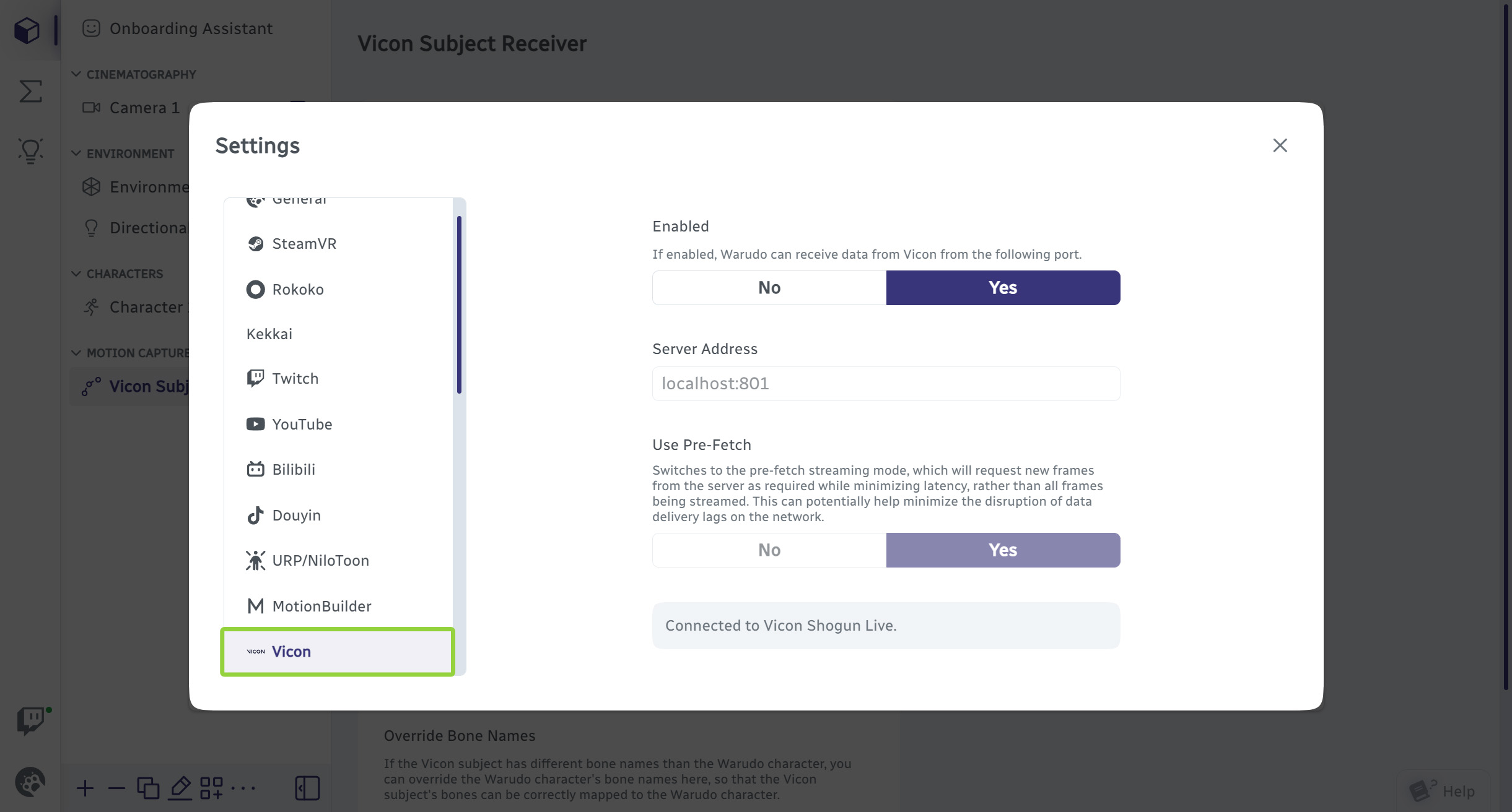 Set Enabled to Yes. You should see a status message that says "Connected to Vicon Shogun" once Warudo establishes the connection.